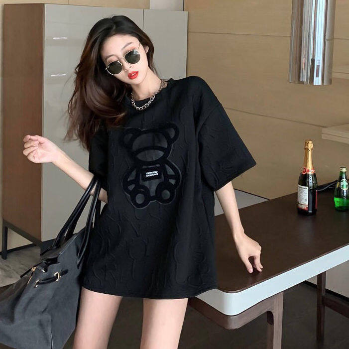 【40-80Kg】Plus size ins tshirt for women Korean version BF bear embroidery short sleeve loose all-match casual bottoming shirt