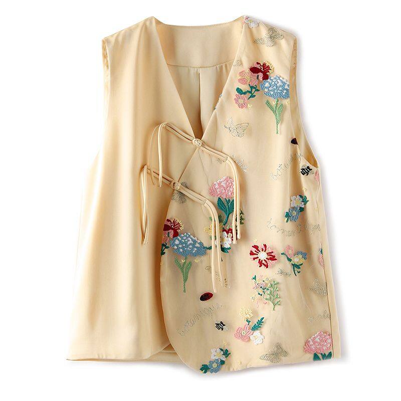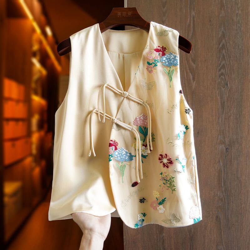 Joso Apricot Pink Senior Sense of Summer Chinese Vest Women Summer Suit Original Design Mesh Embroidery Country Tide Wind Plate Buckle Top