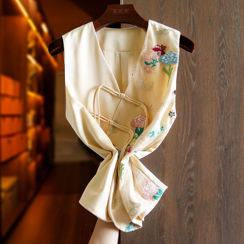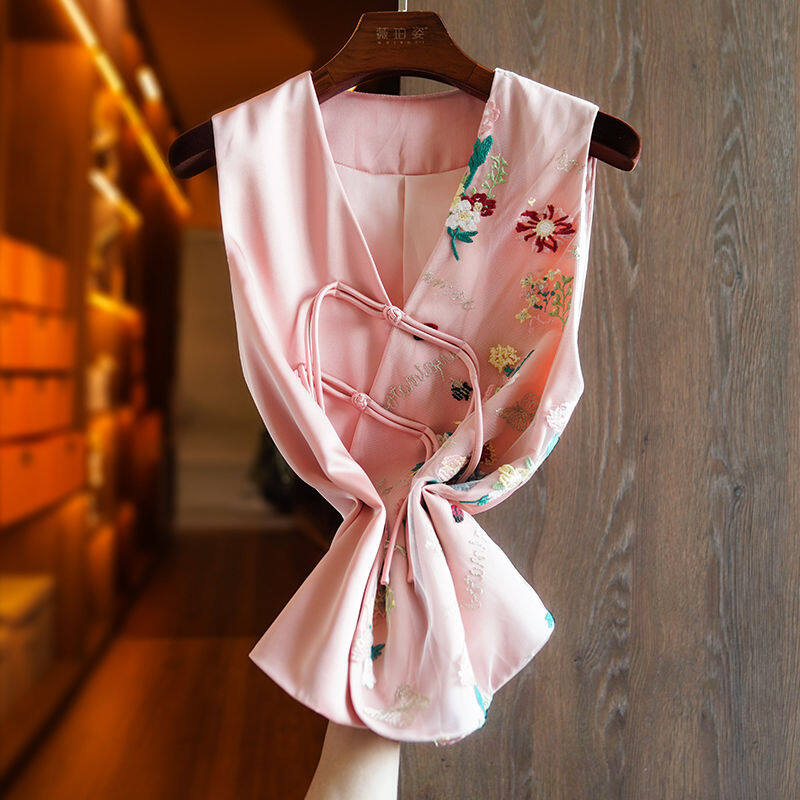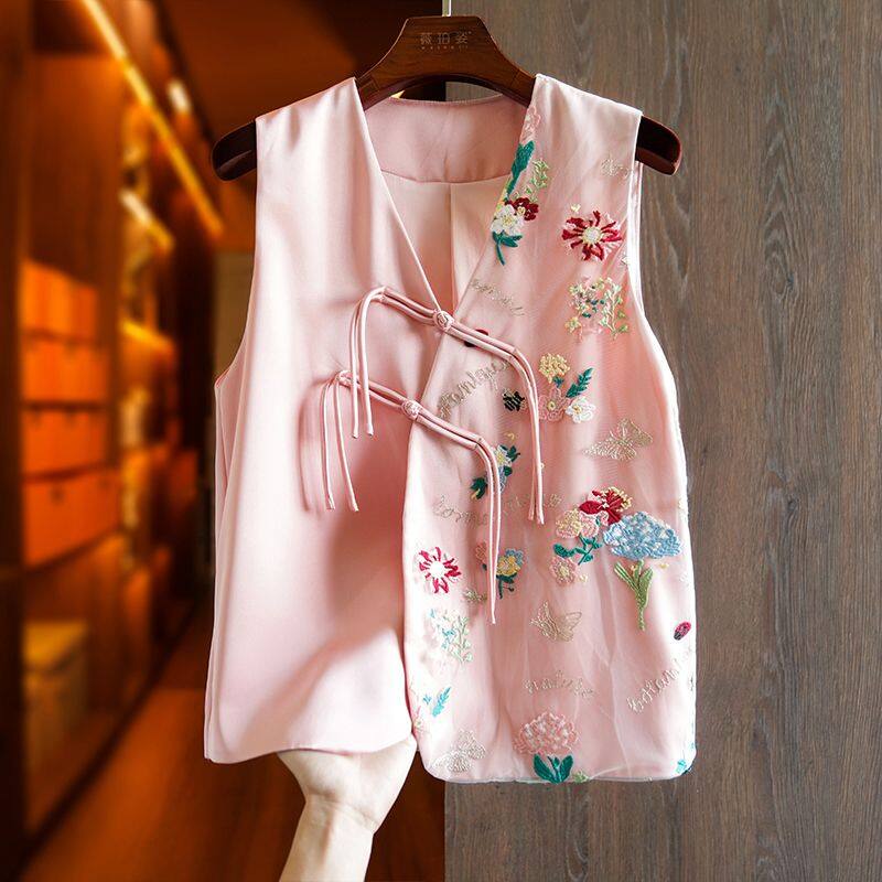 Joso Apricot Pink Senior Sense of Summer Chinese Vest Women Summer Suit Original Design Mesh Embroidery Country Tide Wind Plate Buckle Top